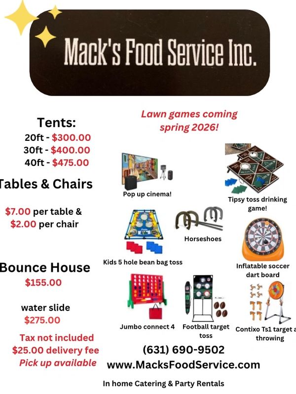Mack's Food Service is an in-home catering service that specializes in authentic Italian-American cuisine. We also offer bounce house rentals to create a happy and friendly environment where both adults and kids can let loose and enjoy themselves. Our talented chefs can prepare any type of cuisine, so don't hesitate to ask. Let us cater your next event and make it a memorable experience!
